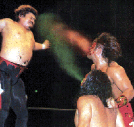 | 【写真】これが毒霧攻撃。右奥がグレート・ムタ、右手前がグレート・カブキ |